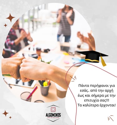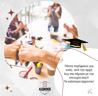 Η επιτυχία των μαθητών μας δεν είναι τυχαία. Είναι το αποτέλεσμα της σκληρής δουλειάς, της αφοσίωσης και της επιμονής τους, καθώς και της υποστήριξης και της καθοδήγησης από την έμπειρη και αφοσιωμένη ομάδα καθηγητών μας. Στην Algominds, πιστεύουμε ότι κάθε μαθητής έχει τη δυνατότητα να επιτύχει τους στόχους του, και εργαζόμαστε αδιάκοπα για να τον υποστηρίξουμε σε κάθε βήμα της πορείας του.